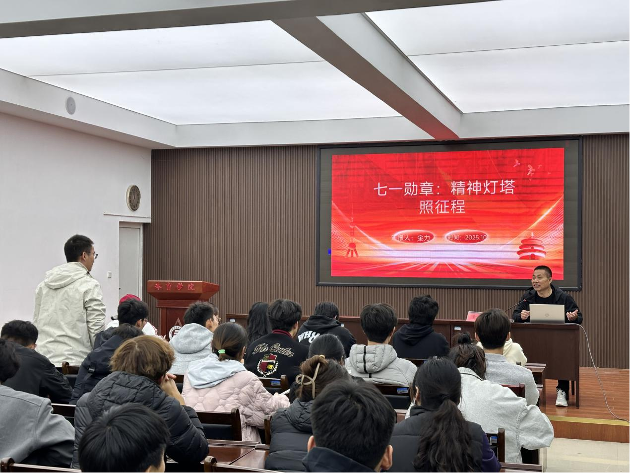 10月28日晚,体育学院副院长兼教师第三党支部书记金力在体育学院121会议室为第57期入党积极分子讲授主题为《七一勋章:精神灯塔照征程》主题党课。
