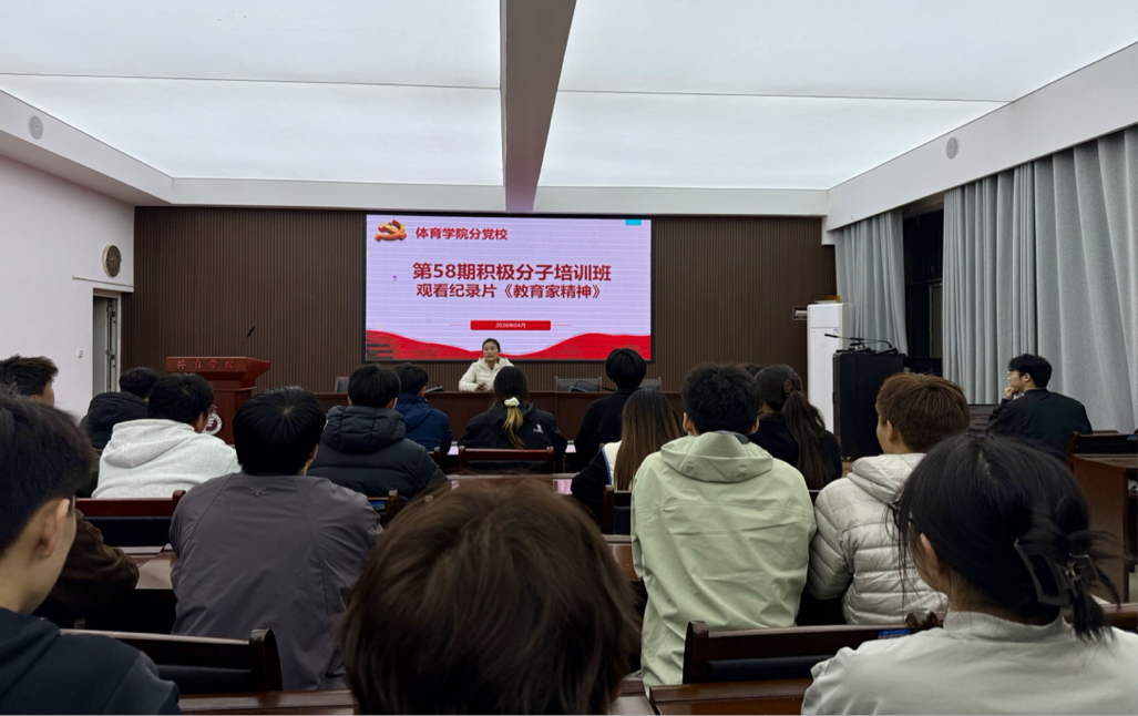 4月10日,体育学院分党校组织第58期入党积极分子集中观看央视纪录片《教育家精神》,体育学院学生第二党支部书记王艳利出席活动。会上,王艳利强调教育家精神是新时代教育工作者的精神旗帜,鼓励体育教育专业学子将精神内涵融入专业学习,践行育人初心。