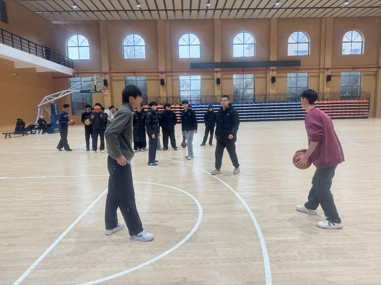 2025年12月18日上午第1节,新进教师体育学院贾健老师的《篮球A》技术课在篮球馆进行展示课,体育学院郭荣娟、刘浩、周一丹等老师现场观摩听课。
