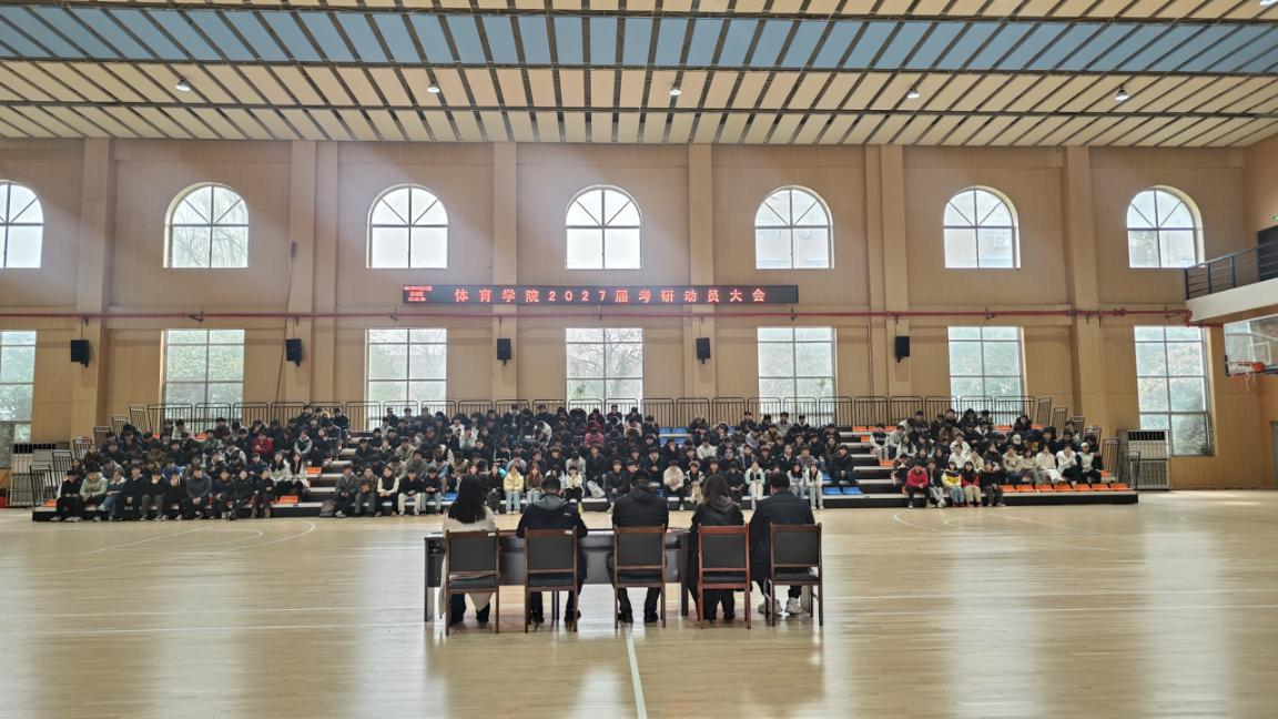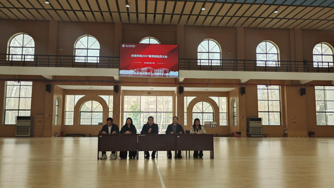 3月13日下午,体育学院2027届考研动员大会在篮球馆召开。学院党委副书记孟琛博、副院长蔡浩刚、学工办主任孙烨,团委书记杨冉冉及2023级全体学生参会,会议由教学办公室副主任崔忠磊主持。